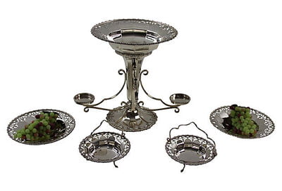 Silver-plate centerpiece with pierced design and gadrooned edges. Two removable hanging baskets, two removable plates, and a removable bowl in the center (when removed, the base turns into a vase). Base, 13.5"Dia x 9"H. Bowl, 9"Dia x 2.5"H. Plates, 7.25"Dia x 1.5"H. Baskets, 5"Dia 5"H.