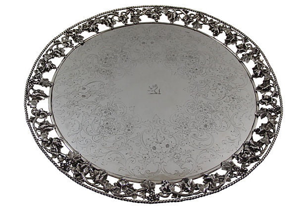 Round hand-engraved silver-plate gallery tray. Raised on three feet. Made in England, circa 1860.