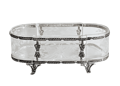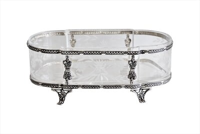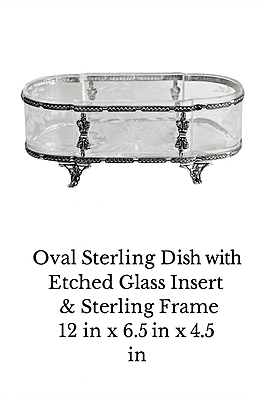 Oval Sterling Dish with Etched Glass Insert & Sterling Frame 12 in x 6.5 in x 4.5 in. SKU #: C1401.