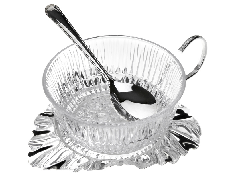 Silver Plated Leaf Stand with Handle, Spoon and Decorative Glass Jam Dish H 2" W 5 11/16" L 6 7/8"