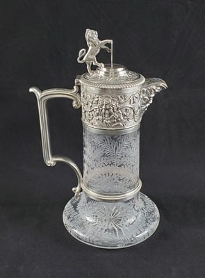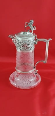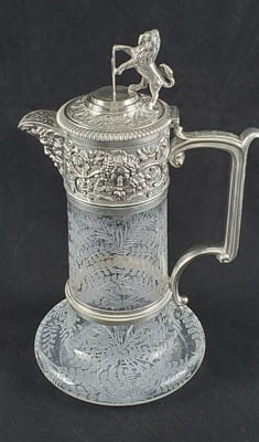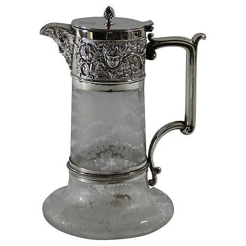 Hand Etched English silver-plated & glass claret jug, c.1860.