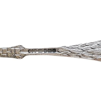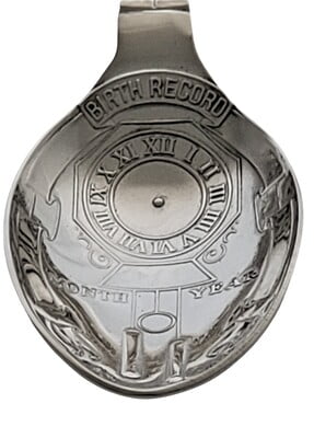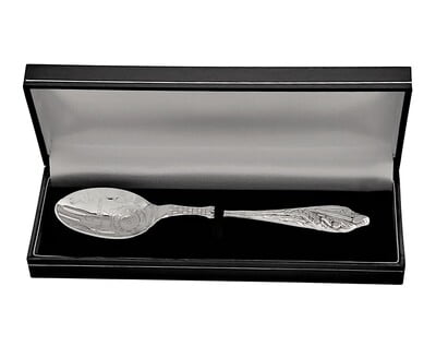 This elegant and heavy birth record spoon is crafted from English sterling silver and comes in a beautiful presentation case. The spoon features intricate engravings and has designated spaces for personalizing with the following birth details: