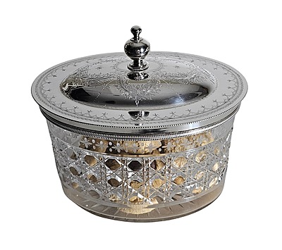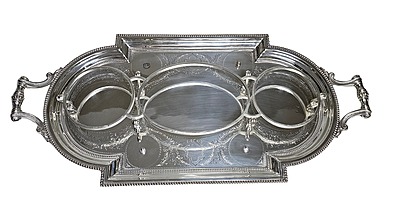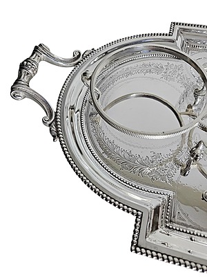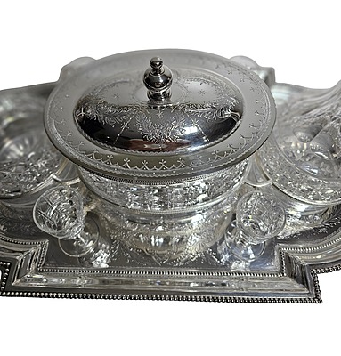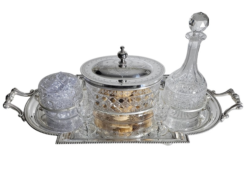 This exquisite one-off silver plate set, crafted by the renowned Atkin Brothers during the Victorian era (circa 1860-1870), showcases exceptional craftsmanship and historical significance. The set includes a fantastic oval hand-cut and engraved biscuit box, a decanter with a stopper, an ice holder, and four small glasses, all elegantly arranged on a fitted hand-engraved tray with elaborate handles. Measuring 23 inches long, 11 inches wide, and 11 inches high, this set is a stunning example of Victorian artistry and a valuable addition to any collection.