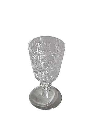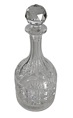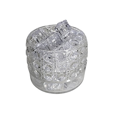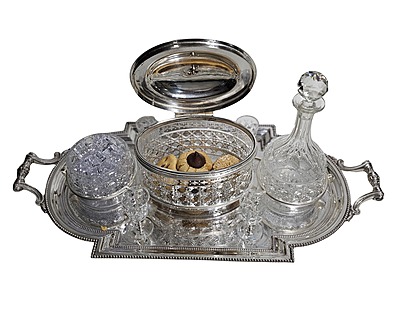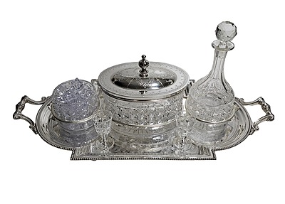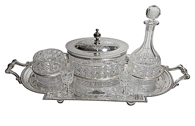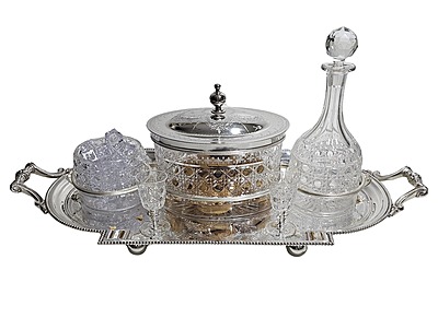 biscuit box, a decanter with a stopper, an ice holder, and four small glasses,