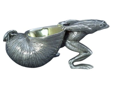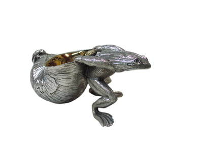 This frog and snail open salt is one of our most iconic pieces. Made of silver plate, it has been a talking point at dinner parties for the last 20 years. This piece is fun, beautifully made and a highly useful table top gift.