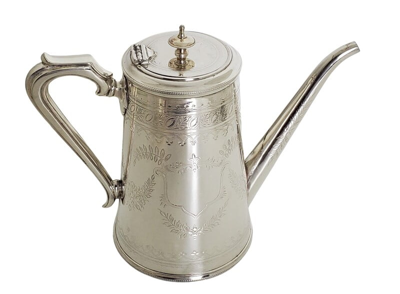 Coffee Pot Round Engraved English Silver Plate c.1871