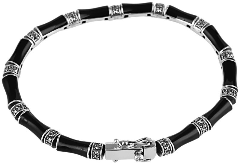 Bracelet Black Enamel & Marcasite Set Bamboo Style with Safety Catch English Sterling Silver 7.75". SKU #: BT525.