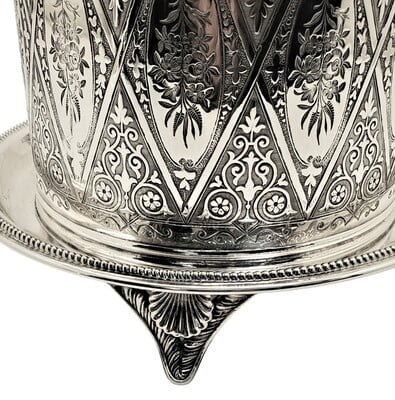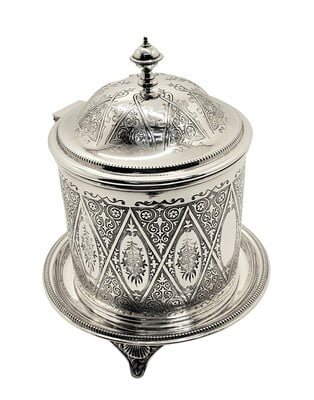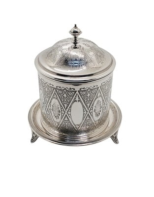 Silver plated biscuit boxes are containers for storing and serving biscuits or cookies. They are usually made of metal with a heavy layer of silver on the surface to give them a shiny and elegant appearance. Silver plated biscuit boxes come in various shapes, sizes, and designs, ranging from simple cylinders to ornate barrels, shells, or tins. Some have hinged lids, while others have removable covers. Some have handles, feet, or pedestals for easy carrying or display. Some have decorative features, such as piercing, engraving, or motifs. Silver plated biscuit boxes were popular in the 19th and early 20th centuries, especially in Britain, where they were often used for afternoon tea. They are now considered collectible items and can add a touch of vintage charm to any home.