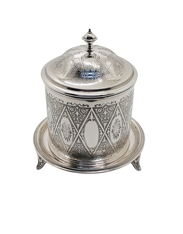 Round Engraved Biscuit Box English Silver Plate c. 1875