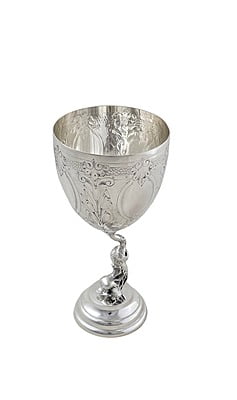 Goblet Embossed With Dolphin Stem Foot 7.5"h inc handles) English Silver Plate c.1865