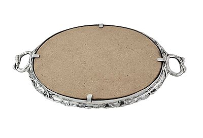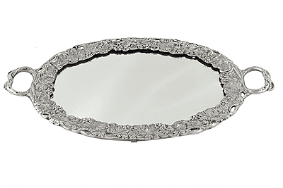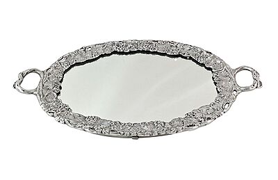 Mirror Plateau with Grapevine Handles – Pewter, 14" x 9" Elevate your presentation with this exquisite pewter mirror plateau, measuring 14 inches by 9 inches. Crafted with timeless elegance, it features a lustrous mirrored surface framed by a richly detailed grapevine motif. The dual handles, seamlessly integrated into the ornate border, offer both beauty and functionality—perfect for serving, display, or gifting. Whether used to showcase fine glassware, perfume bottles, or cherished collectibles, this piece brings heritage charm and refined sophistication to any setting. Also perfect for adding a touch of luxury to a bathroom counter—ideal for organizing fragrances, skincare, or decorative accents.
