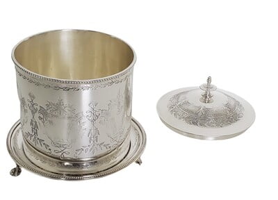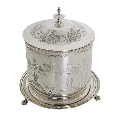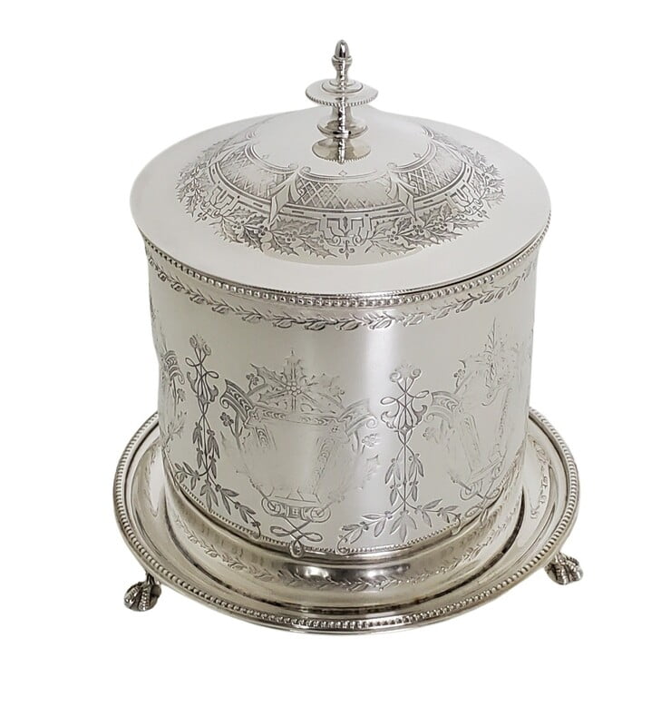 Biscuit Box Engraved English Silver Plate c.1875