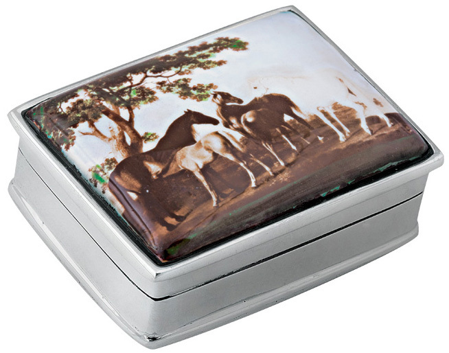 This unique sterling silver horses picture pill box, is meticulously crafted and hand polished to the highest standard, offering the ideal safe place to store your pills or any other small keepsake item. Made from hallmarked sterling silver with a bright and eye-catching enamel topped lid with horses picture, this pill box would make an ultimate gift for an animal lover or equestrian fan.