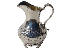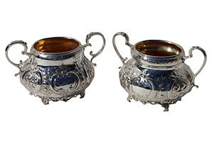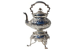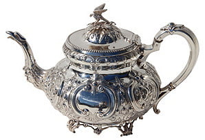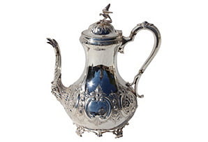 Beautiful floral engraved seven-piece tea set on feet. The kettle is on a stand and, along with the coffee pot and teapot, has a bird with spread wings as a finial. Made of silverplate in England around 1860. No maker's mark. Dimensions: kettle on stand, 10.5"L x 8"W x 16.5"H; teapot, 11"L x 4.75"W x 7"H; coffee pot, 10"L x 4.5"W x 10.75"H; sugar bowls, 7.75"L x 4.5"W x 5"H; creamer, 5"L x 2.75"W x 5.75"H.