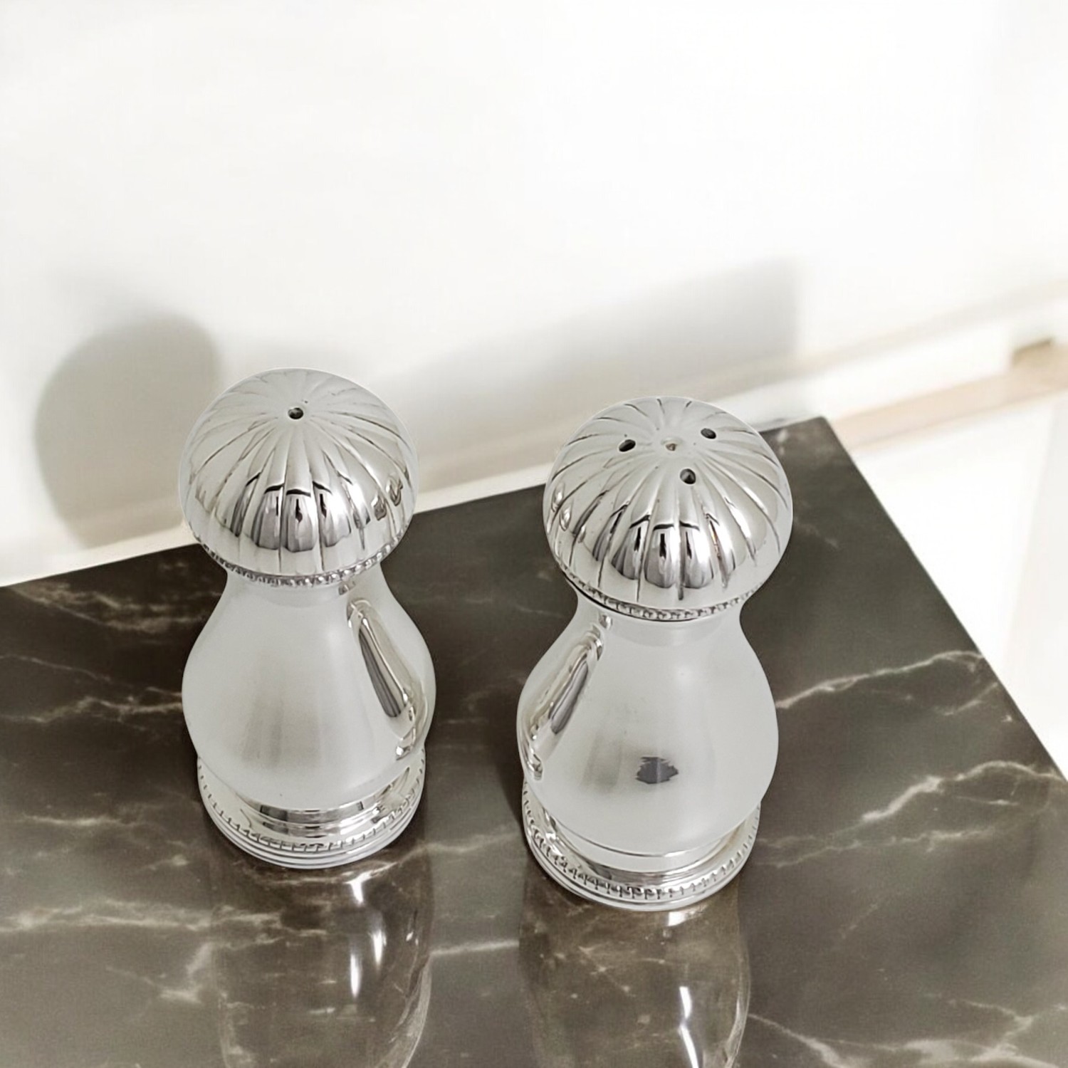 Heavy Quality Silver Plate Salt & Pepper Set 3.75"high. This exquisite salt and pepper set showcases a timeless design, made of heavy-quality silver plate for enduring elegance. Each piece features removable screw-on fluted tops with plastic inserts, providing a layer of hygiene and practicality. The set is beautifully presented in a fitted presentation box, making it a perfect gift or a sophisticated addition to your tableware collection.