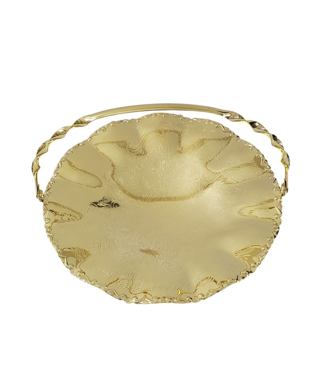 Silver Plated Wavy Edged Plate with Twisted Swing Handle and Ball Feet. Dimensions: 9" diameter (Gold Finish)