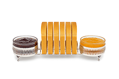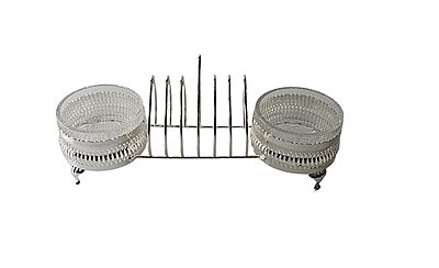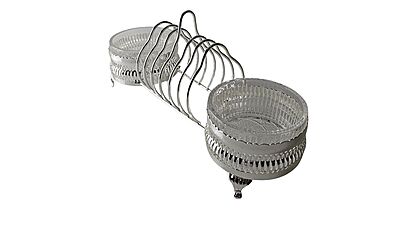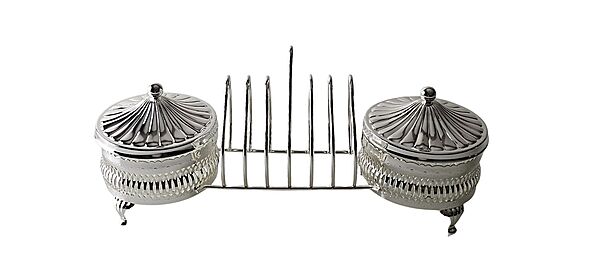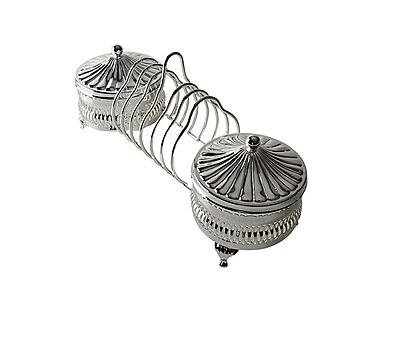Queen Anne 7-Bar Toast Rack with Butter & Preserve Dishes English Silver Plate | Non-Tarnish Finish | 12" L × 4" W × 6" H Elevate your breakfast table with this exquisite Queen Anne-style toast rack, crafted in non-tarnish English silver plate. Featuring seven gracefully arched bars, it securely holds up to six slices of toast in upright elegance. Flanking each side are matching condiment containers with cut-glass inserts and fluted silver lids—perfect for serving butter, jam, or marmalade with refined charm. Design: Classic Queen Anne silhouette with ornate feet and symmetrical layout Materials: Silver-plated frame with non-tarnish finish; clear glass inserts with fluted lids Functionality: Central toast rack with two side dishes for condiments Dimensions: 12 inches long × 4 inches wide × 6 inches high Use: Ideal for formal breakfast service, afternoon tea, or heritage-inspired gifting This piece blends tradition and utility, making it a timeless addition to any silver collection or luxury table setting.