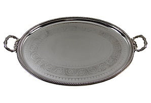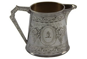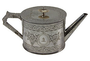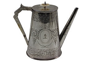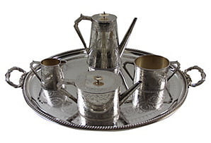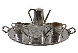 Hand-engraved silver-plate tea and coffee set with matching tray. Made in England circa 1870. Coffeepot: 10"L x 4.5"W x 9"H; teapot: 10.75"L x 4.5"W x 6"H; sugar bowl: 8.5"L x 4"W x 4.25"H; creamer: 5.75"L x 3"W x 4.5"H; tray: 29"L x 19.5"W x 2.5"H.