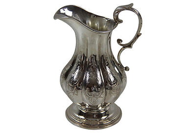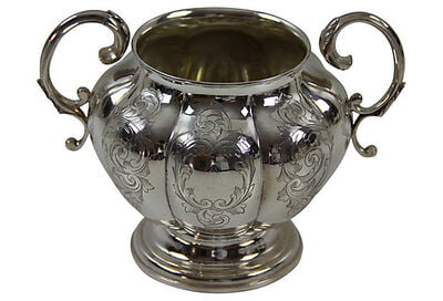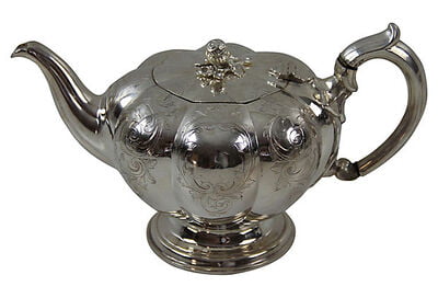 Four-piece silver-plate tea and coffee set with engraved flutes and detailed melon finials. Marked by both the maker and the individual craftsmen involved. Made in England, circa 1860. Coffeepot, 10.25"H x 9"L x 5"W; teapot, 10.5"L x 5"W x 5.75"H; cream jug, 6.25"H x 4.3"L x 3"W; open sugar, 7"L x 5.1"W x 5.1"H.