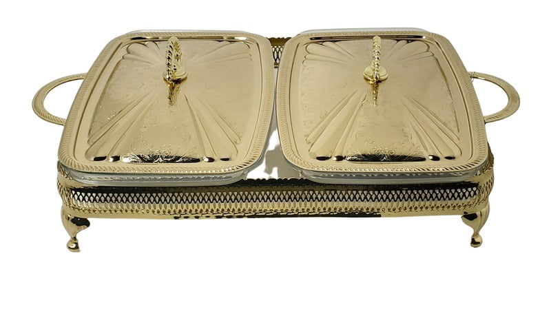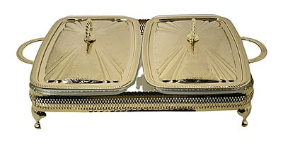 | Large Double Casserole/Lids 6"h x 12 1/2"w x 19"l English Silver Plate Tarnish Resistant (Gold Finish) |