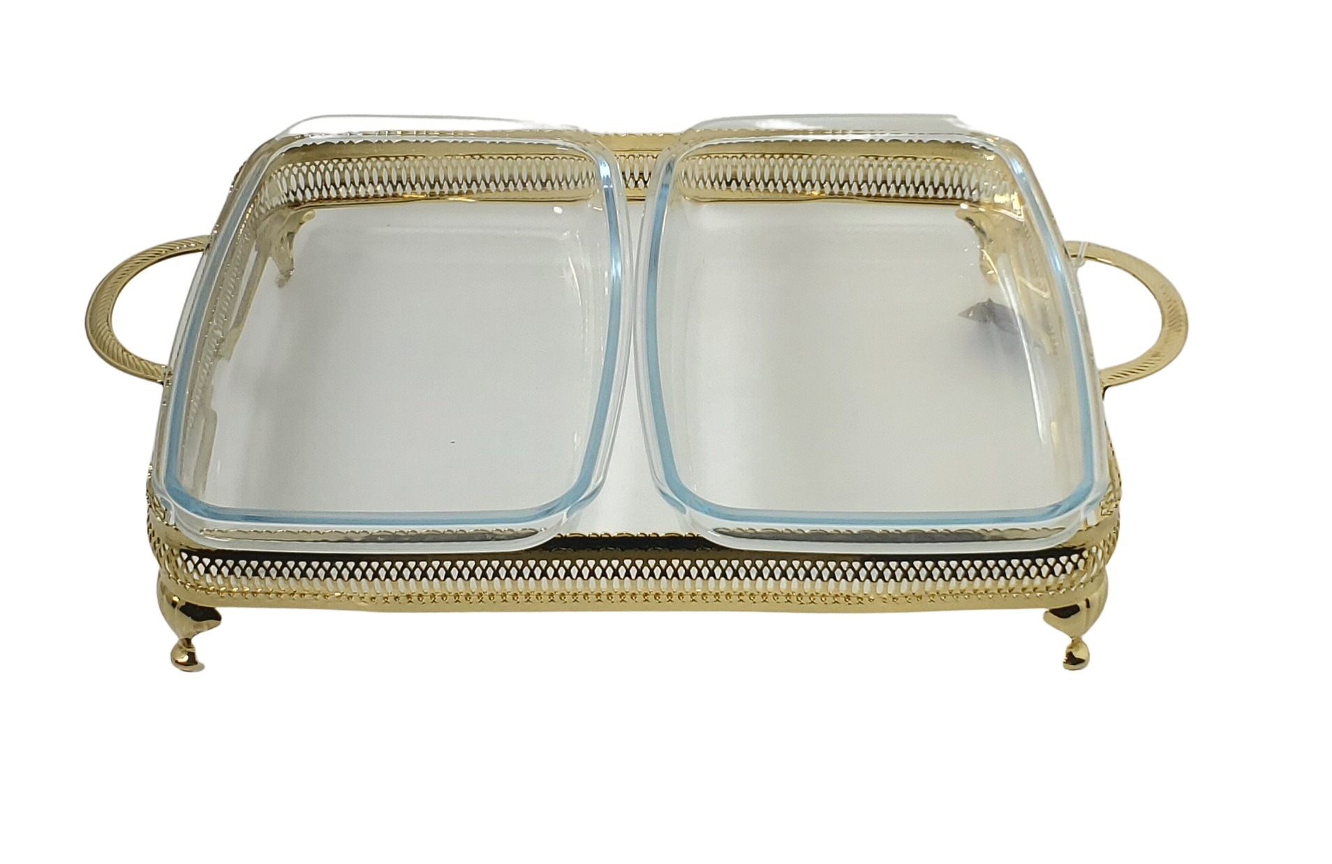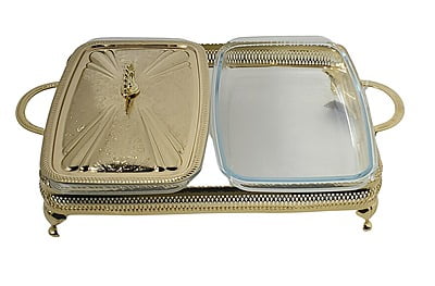 Silver Plated Gallery Frame with Handles and Legs. 2 Oblong "Oven to Tableware" Glass Casseroles, complete with Silver Plated Decorative Lids with Diecast Handles Dimensions: 19" x 12 1/2" x 6" (Gold Finish)