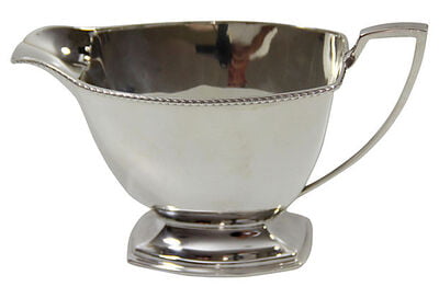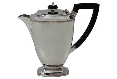 English four-piece silver-plate tea and coffee set, circa 1900. The only embellishment is a single delicate gadrooned edge on each piece and black wood handles. Teapot, 11.75"L x 4.5"W x 6.5"H; coffeepot, 8"L x 3.5"W x 7.75"H; cream jug, 6.5"L x 3.75"W x 3.75"H; sugar, 6.25"L x 3.75"W x 3.75"H.