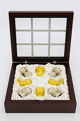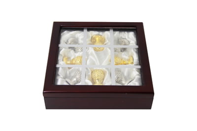 Premium Quality Indulge in the artistry of our Silver-Plated and Gold-Plated Tic Tac Toe set, featuring 1.5" tall, weighty Golf Ball shaped pieces that exude sophistication. Each token is nestled within a silk-lined mahogany box, topped with a grid-aligned glass lid—measuring 6.5 x 6.5 x 1.9 inches. Designed for both display and play, this heirloom-quality set transforms a classic game into a luxurious experience.