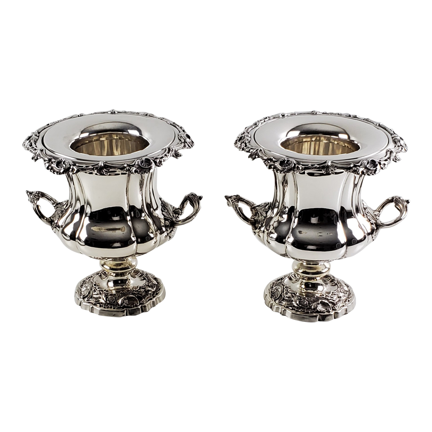 Complete with removable ice liners, finely cast twin handles, and intricate detailing along the rim and pedestal, these immaculate coolers not only serve a practical purpose but also tell a story of craftsmanship and tradition, ideal for display or refined service in elevated hospitality environments or in a unique home.