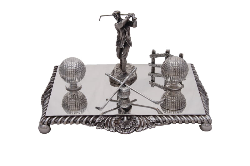 Inkstand   Large Golf Design with 2 Golf Ball Topped Bottles Silver Plate