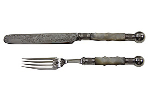 English Victorian boxed dessert utensil set with service for 12. Carved and polished mother-of-pearl handles end in silver-plate spheres. Made in England, circa 1860. Knives, 7.6"L; forks, 6.6"L.