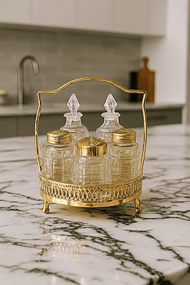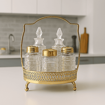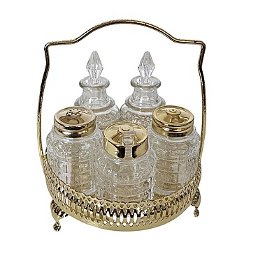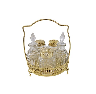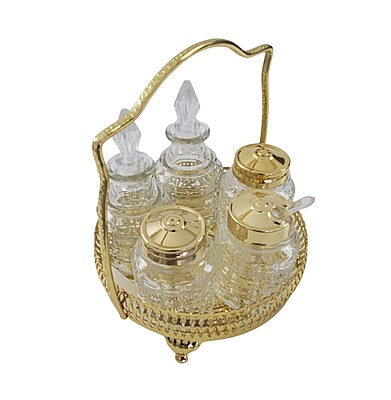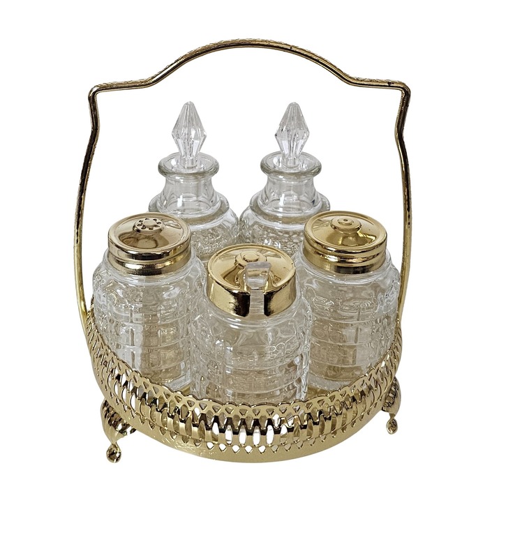 Silver Plated Gallery Base with Legs and Handles, 5 Glass Bottles, 2 Plastic Stoppers, Silver Plated Salt, Pepper & Mustard Tops and Plastic Mustard Spoon. 5 Pce Round Cruet 5 1/2" dia (Gold Finish)