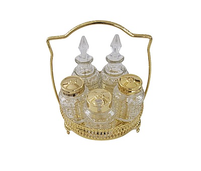 Queen Anne 5 Pce Round Cruet 5 1/2"dia x 6 3/4"h English Silver Plate Tarnish Resistant (Gold Finish). SKU #: Q4/4719.