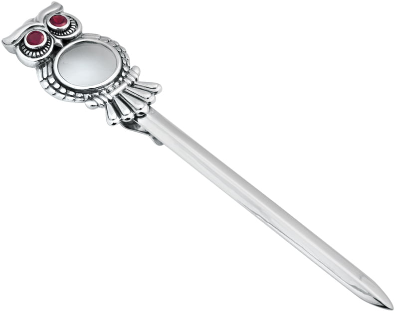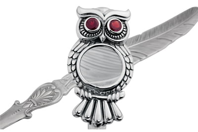 Made from hallmarked sterling silver, This premium letter opener and / or bookmark with magnifying glass owl, takes inspiration from the Art Nouveau period. Meticulously crafted by skilled British Silversmiths, this owl letter opener or bookmark features a magnifying glass in the centre of the owl. Designed and made in Britain, this owl is set with red garnet stones for eyes and features a clip on the back for use as a bookmark. A practical present for an avid reader or organiser.