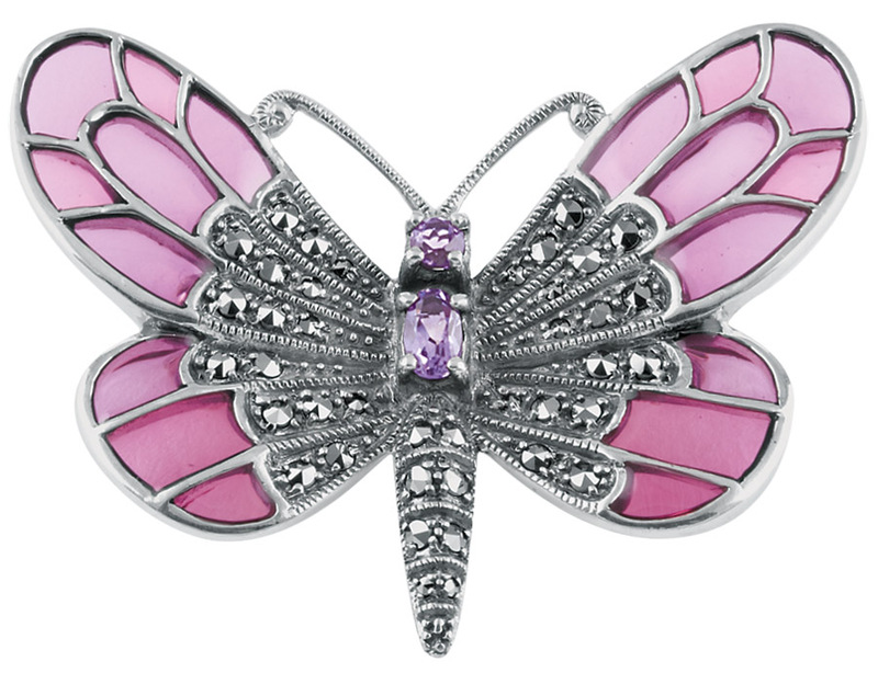 Brooch Butterfly Design Pinkish Purple Enamel with Marcasite Sterling Silver 1.5" x 1.75"