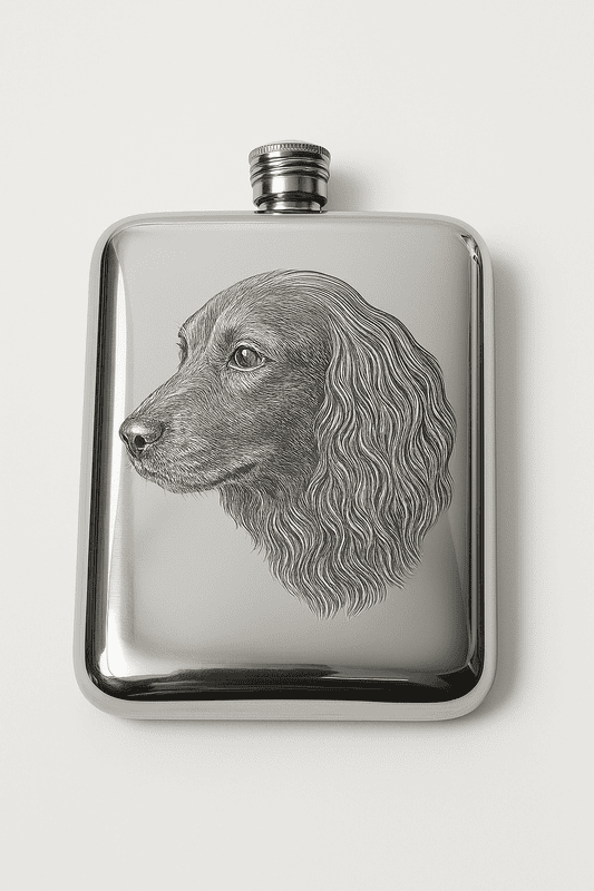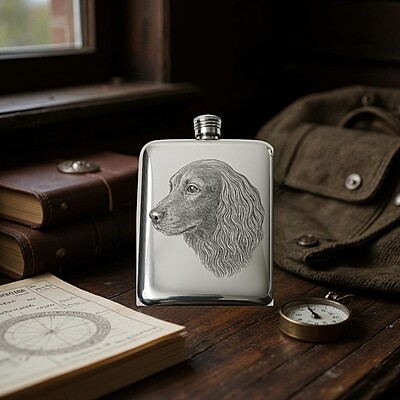 Savor the Essence of Craftsmanship: Our Spaniel  Head 6oz Pewter Flask is more than a container; it’s a symbol of tradition and elegance. Encased in a sleek black pouch and presented in a luxurious box, this flask is an ideal gift for those who cherish the finer spirits in life. Embrace the legacy with every sip.