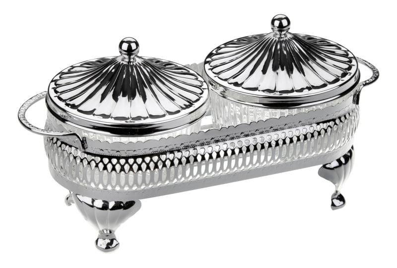 Queen Anne 2 Pce Round Party Set 5"h x 4 1/3"w x 9"l English Silver Plate (Tarnish Resistant). SKU #: 0/4922.