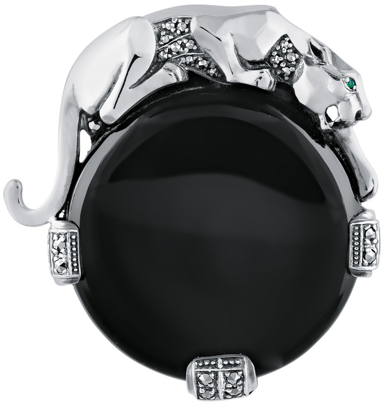Brooch Panther on Onyx, Marcasite and Emerald Set English Sterling Silver 2 1/8" x 2"... SKU #: B361.