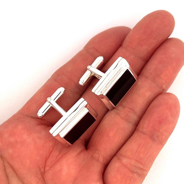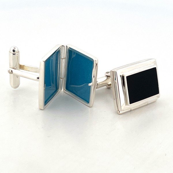 Sterling Silver & Onyx Keepsake Cufflinks – Ingenious Locket Design An elegant fusion of timeless style and sentiment, these hallmarked sterling silver cufflinks are more than just an accessory—they're a personal keepsake. The polished sterling silver frame is beautifully accented with deep black onyx, creating a sophisticated contrast. What makes this pair truly exceptional is the discreet locket feature, allowing the wearer to hold four miniature photographs close at all times.