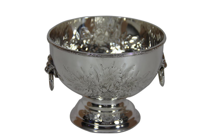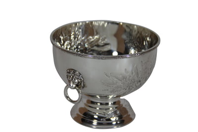 Hand chased 6" Bowl with Lion Handles Silver Plate. SKU #: C15002.