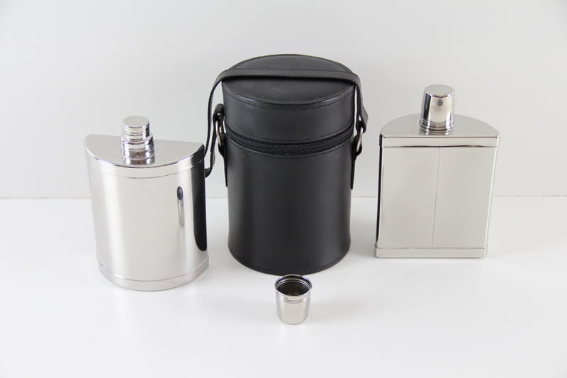 Double Large Stainless/Black Leather Flask Set. SKU #: KMKW33.