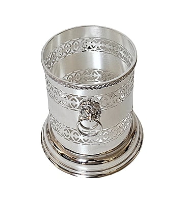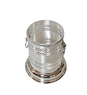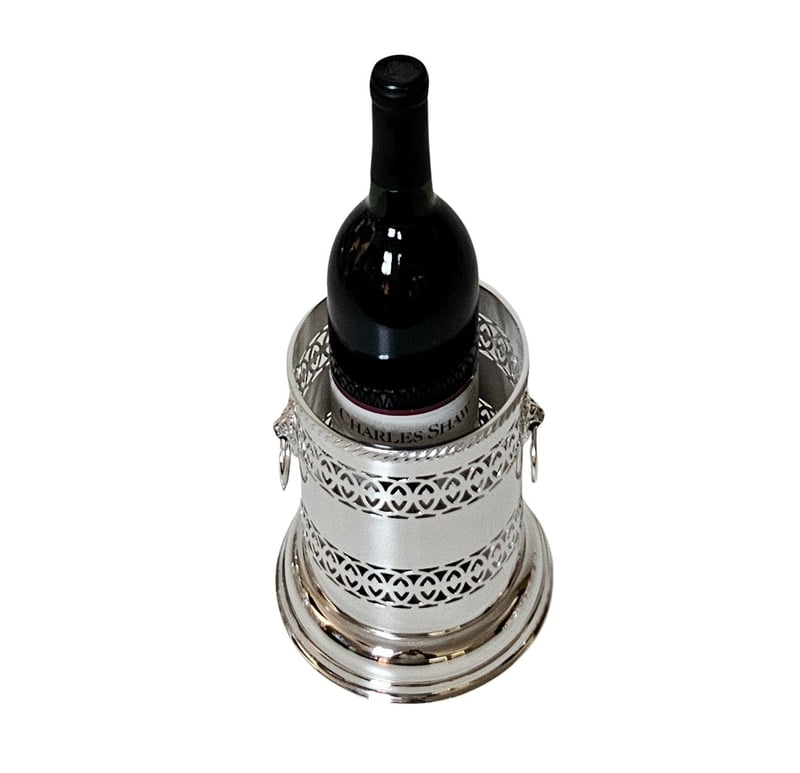 Syphon Stand (Pierced) Used as a Wine Bottle Stand Description: This silver-plated syphon stand features intricate hand-pierced patterns, making it a delightful addition to your collection. Dimensions: Approximately 5.5 inches wide (including handles) and 6 inches high. Takes Bottle 4.75" wide. Functionality: Originally designed for syphons (devices used to carbonate water), this stand now serves as a unique wine bottle holder. The pierced design allows light to play through, adding visual interest. pristine condition. Provenance: Imagine the occasions when this stand graced elegant dining tables or adorned sideboards.
