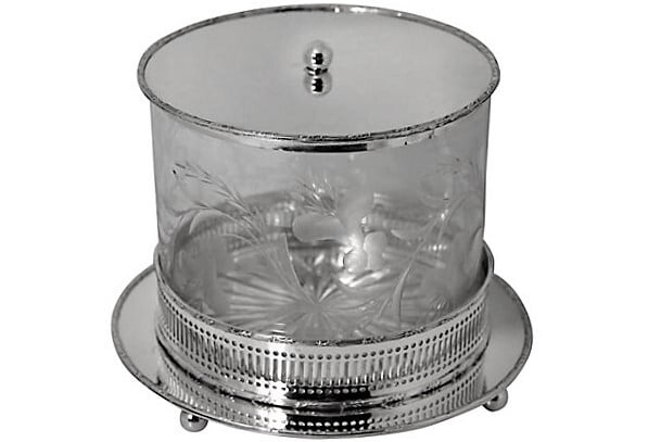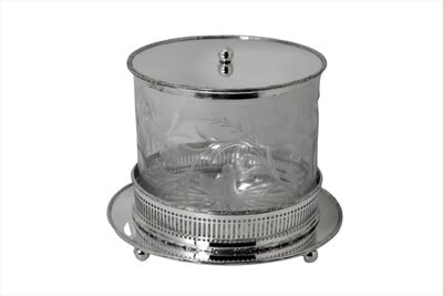 Etched glass & silver-plate biscuit box, made in England, c.1890.