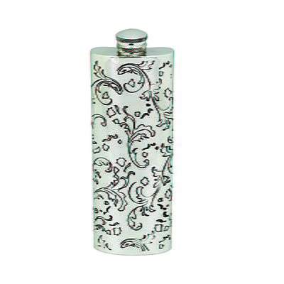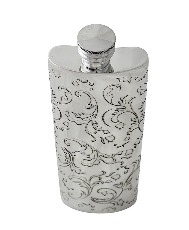 Experience the beauty and functionality of this 5oz pewter flask. The intricate floral design, meticulously etched onto both sides, adds a touch of elegance and sophistication. The polished pewter finish and sleek shape make it a stylish companion for any adventure. The flask comes with a protective pull-string bag and a presentation box, making it a truly special gift.