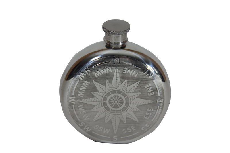 Spirit Flask – Round Shape with Classic Compass Design, 6 oz, English Pewter