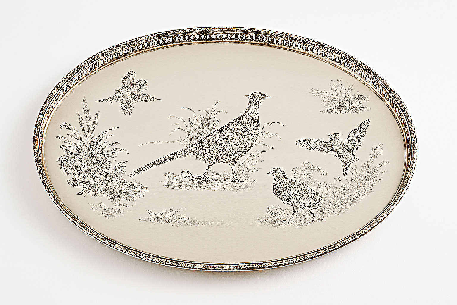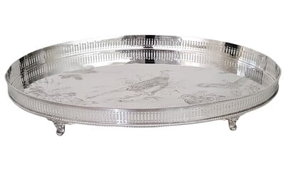 Tray 18" x 12" Oval Pheasant Design Bar Gallery English Silver Plate