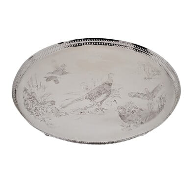 Tray 18" x 12" Oval Pheasant Bar Gallery Tray English Silver Plate. (3 Left) SKU #: C1699.