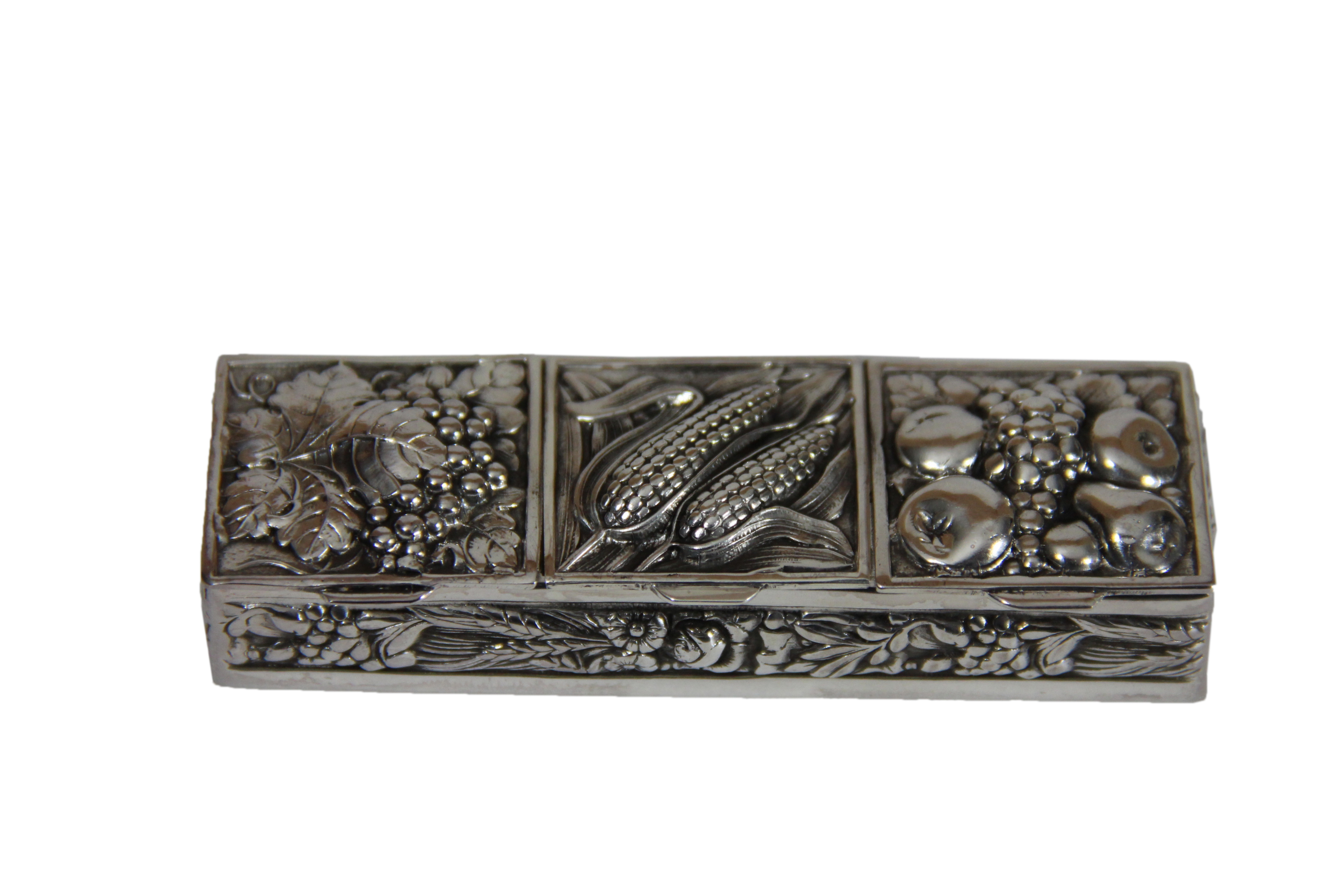 Pill Box-Fruit & Vegetable on Large Lid ..1'Wx3.25'L Silver Plate. SKU #: T3186.