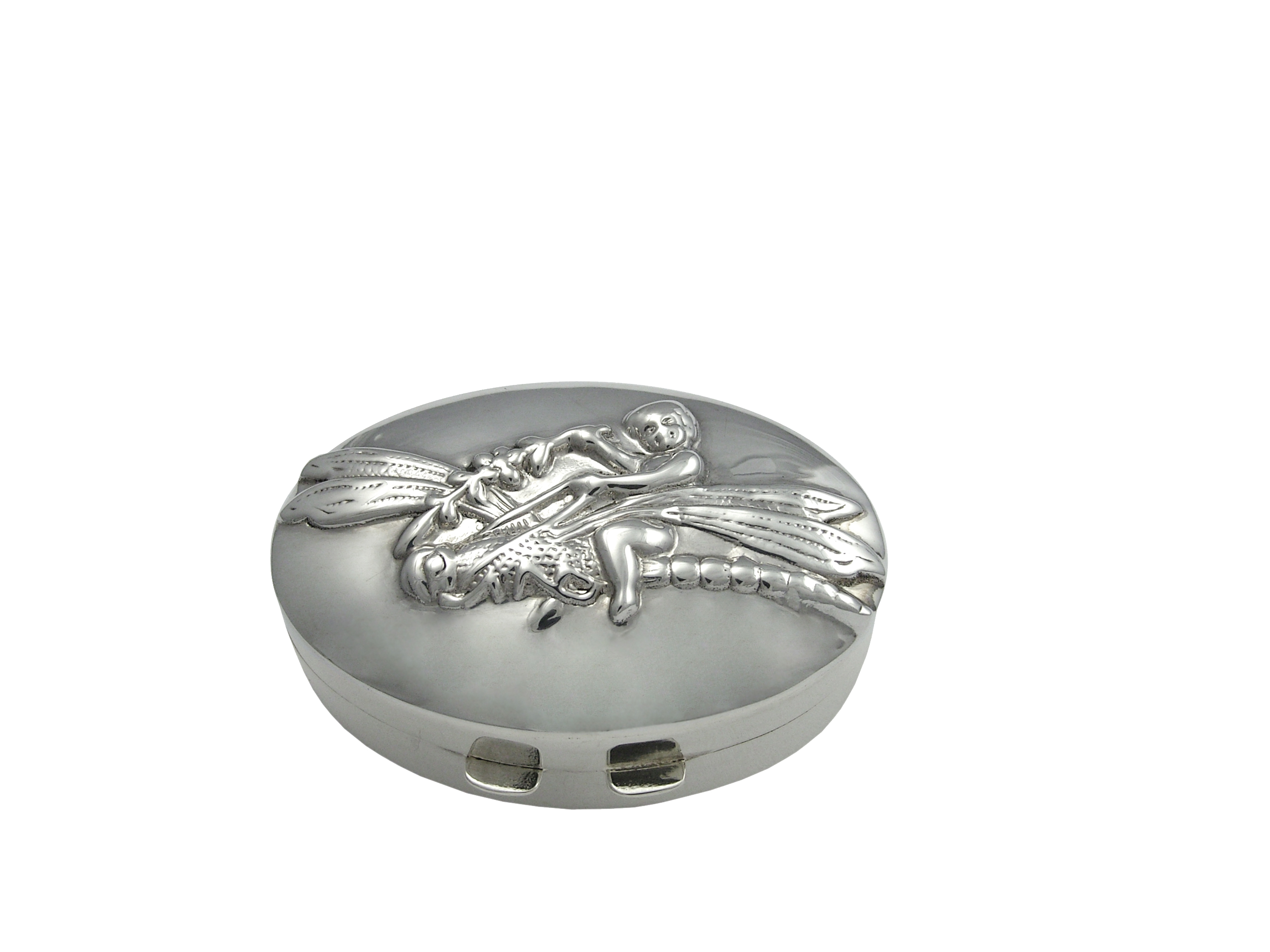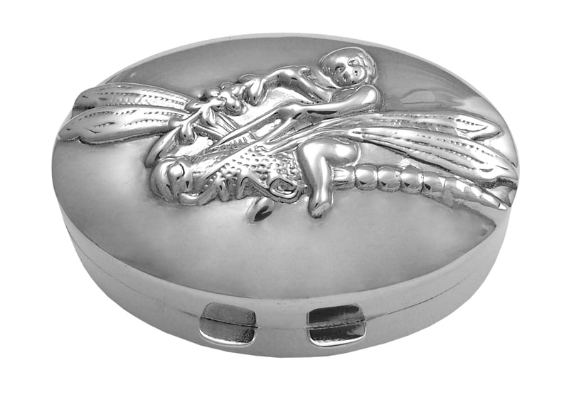 Pillbox Oval Shaped with Fairy on Dragonfly 2"L X 1.25"W X .75"D English Sterling Silver. SKU #: PB471.