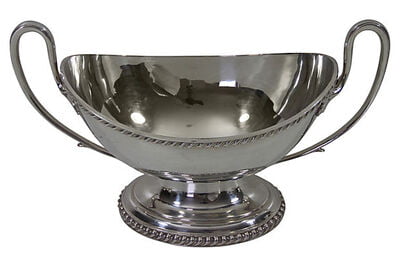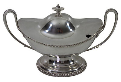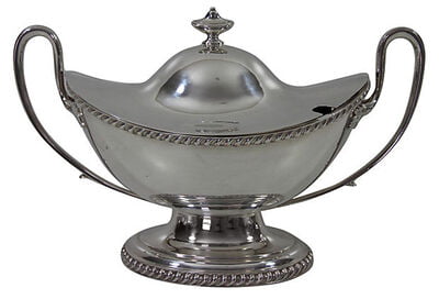 Boat-shaped silver-plate soup tureen with gadrooned edge. Made in England, circa 1860. No maker's mark.