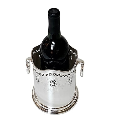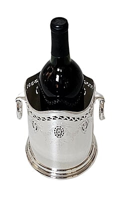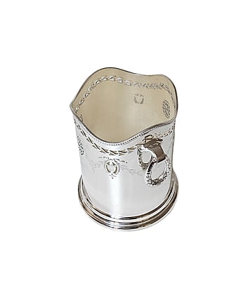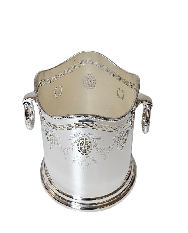 This exquisite English Silver Plate Syphon Stand from circa 1875 is a remarkable piece of craftsmanship. It features a pierced and engraved design with elegant drop handles, adding to its antique charm. The dimensions are quite specific, with a 5.25" base, 4.75" inside top, and a height of 6.25". Such pieces were often used to hold siphon bottles or decanters and were a staple in the sophisticated dining rooms of the Victorian era.